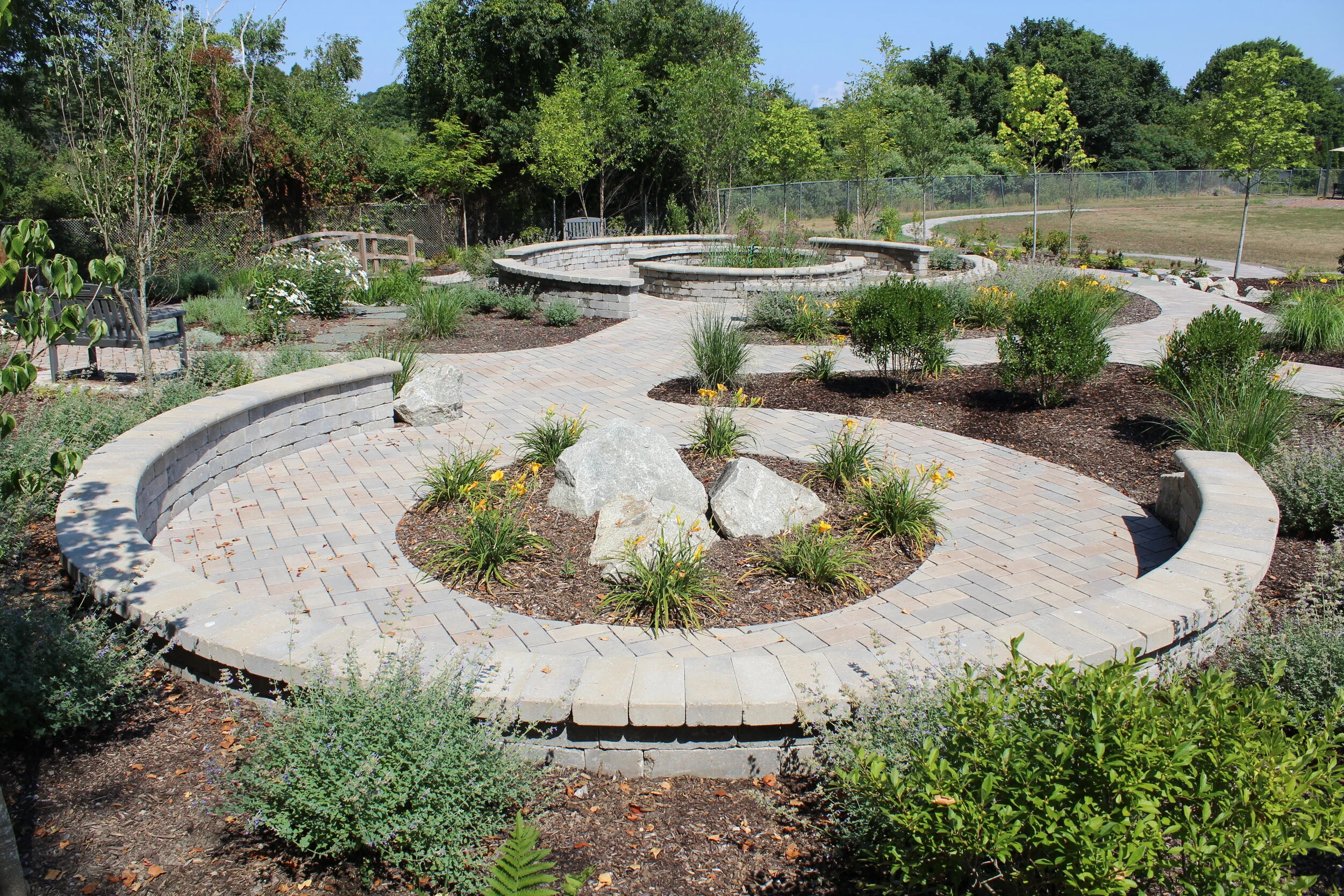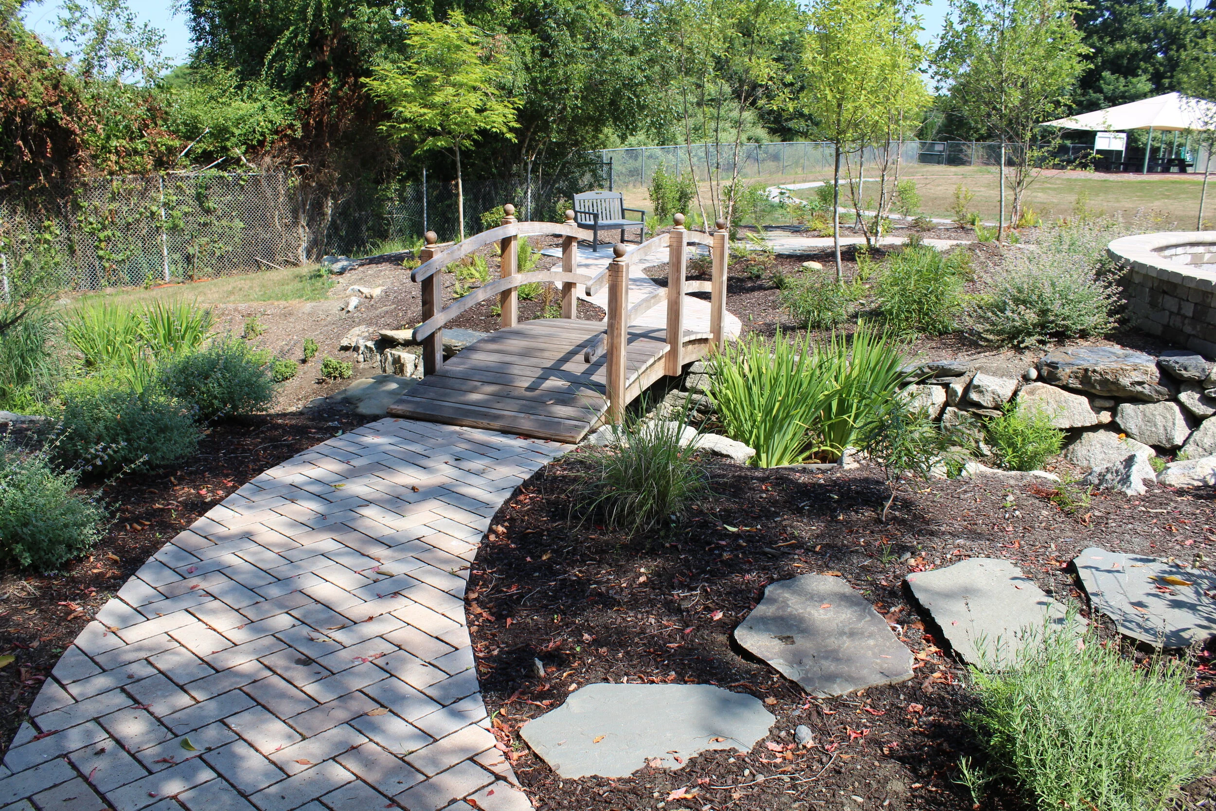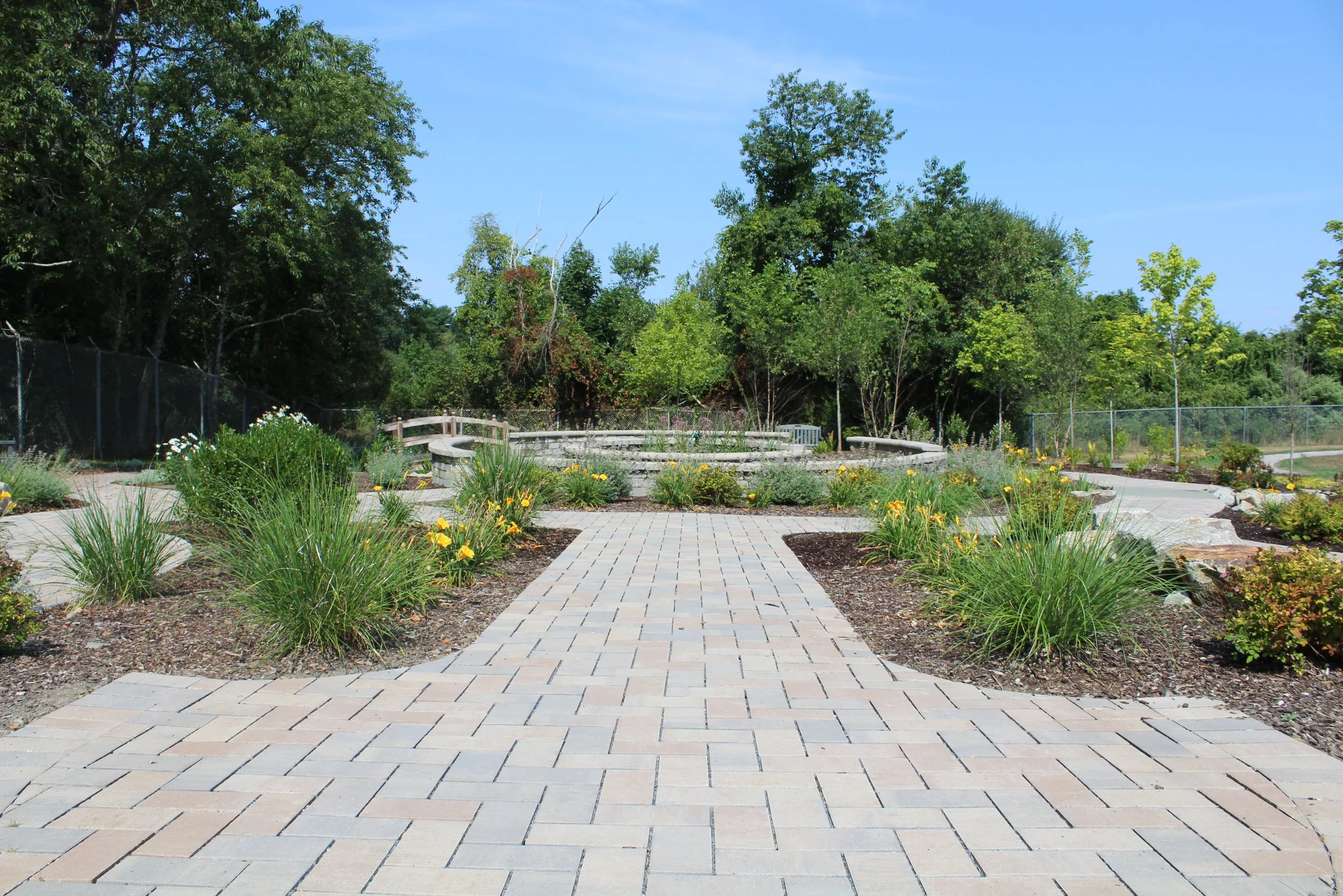 This Outdoor Learning Activity Zone acts as an outdoor classroom. The design incorporates a rain garden, which collects polluted stormwater that would normally flow into Melville Pond, an integral water source in the Narragansett Bay Watershed. Each year it removes an average of .48 pounds of phosphorus, .33 pounds of zinc, and 4.28 pounds of nitrogen. People of all abilities can enjoy this garden because it is fully handicap accessible.